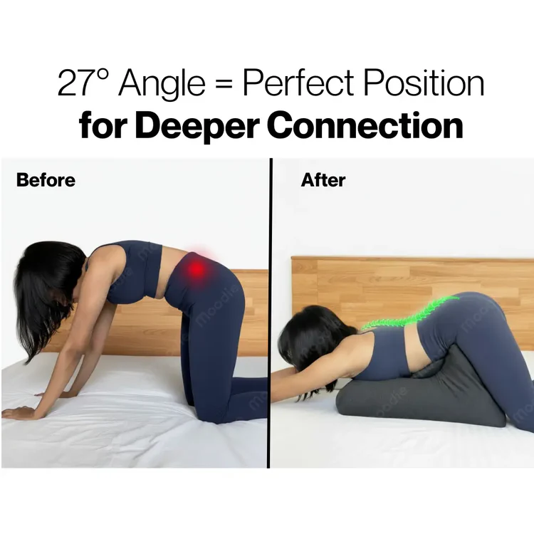 The 27° angle tilts the pelvis to optimize internal contact and pressure distribution. The Moodie Intimacy Pillow's positioning reduces effort for both partners while increasing stimulation in key areas, making the experience more satisfying and less physically demanding.