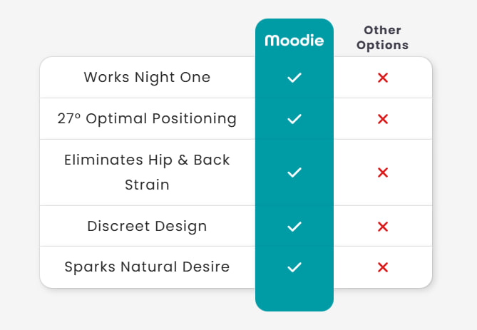 The Moodie Intimacy Pillow is precision-engineered at 27° - the exact angle that removes strain and improves positioning. When physical discomfort is eliminated, natural desire often returns.